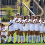 - Senior defender Alyssia Anuat takes a knee during the national anthem. (Photo by Telvee Marvie)