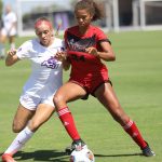 - Freshman defender Chyase Thorn battles head-to-head with Grambling State’s junior forward Laila Loring. (Photo by Telvee Marvie)