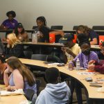 - Students pose for a picture during a loteria game. (Photo by Sammantha Gutierrez)
