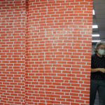 - Laura Baker, associate professor, walks through a decorated entrance into the library commons. (Photo by Shelly Womack)