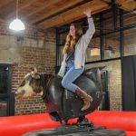 - Avery Reinoehl, senior marketing major from Fort Wayne, rides the bull. (Photo by Shelly Womack)