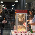 - Mariana Martinez Sandoval, sophomore interior design major from Tatumbla, makes a bucket of popcorn for Chloe Johnson, sophomore child and family services major from Walnut Creek. (Photo by Shelly Womack)