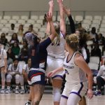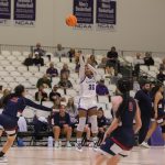 - Tatum Barber, graduate guard, reaches up to catch the ball. (Photo by Meghan Long)