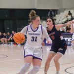 - Sophomore guard Taylor Morgan rushes toward the basket. (Photo by Meghan Long)