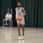- Senior guard Damien Daniels takes the ball up the court in transition. (Photo by Taelyn Williams)