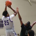 - Redshirt junior guard Immanuel Allen makes a tough shot over his opponent.(Photo by Taelyn Williams)