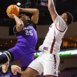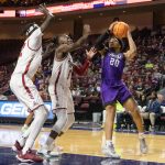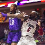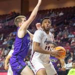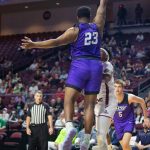 - Redshirt junior guard Immanuel Allen flies toward the backboard and reaches over an Aggie to make a layup. (Photo by Riley Fisher)