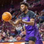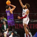 - Redshirt senior guard Tobias Cameron lines up a shot overhead of New Mexico State’s redshirt senior Johnny Mccants. (Photo by Riley Fisher)