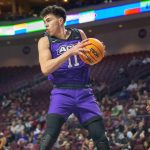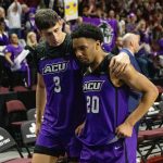 - Senior guard Coryon Mason and freshman forward Leonardo Bettiol leave the court together after congratulating New Mexico State University. (Photo by Riley Fisher)