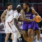 - Redshirt senior guard Tobias Cameron catches a rebound under the net and looks to pass the ball down the court. (Photo by Riley Fisher)