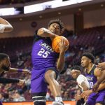 - Redshirt junior guard Immanuel Allen keeps control of a rebound as he falls under the goal. (Photo by Riley Fisher)