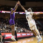 - Junior forward Airion Simmons leaps over an Aggie’s head to block his shot attempt under the goal. (Photo by Riley Fisher)