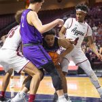 - Several Wildcats protect the ball from the Aggies in their paint. (Photo by Riley Fisher)