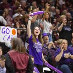 - Eva Straughn, junior engineering major from Abilene, cheers for the Wildcats between free throws in the second half. (Photo by Riley Fisher)