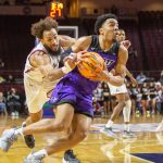 - Redshirt senior guard Tobias Cameron knocks over an Aggie as he stops to pass the ball in the paint. (Photo by Riley Fisher)