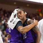 - Senior guard Mahki Morris and redshirt junior guard Immanuel Allen embrace in the final seconds of their last game of the season. (Photo by Riley Fisher)