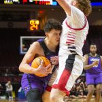 - Redshirt senior guard Tobias Cameron pushes the ball above his defender’s heads to keep it out of their hands underneath the goal. (Photo by Riley Fisher)