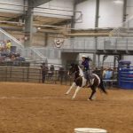 - Shay Kepaa, freshman animal science major from Glencoe, Oklahoma, enters the barrel riding competition. (Photo by Becca Dowell)