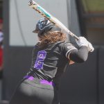 - Junior outfielder Mercedes Eichelberger hits the first home run of the game. (Photo by Taelyn Williams)