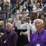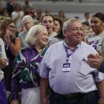 - Rick (‘81) and Debbie (Rains ‘79) Wessel smile to the crowd as they are recognized. (Photo by Sydney Varner)