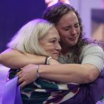 - Graduate student from Wylie Madi Miller hugs Debbie (Rains ’79) Wessel. (Photo by Sydney Varner)