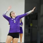 - Sophomore outside hitter Bryley Steinhilber sets the ball. (Photo by Meghan Long)