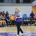 - Emily Sileven, sophomore multimedia major from Van Alstyne, takes a half-court shot for an opportunity to win a $10,000 scholarship. (Photo by Daniel Curd)