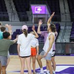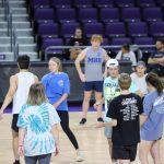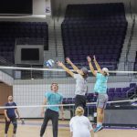 - Participants attempt to block a spike. (Photo by Daniel Curd)