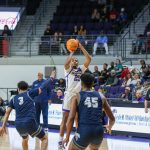 - Immanuel Allen, redshirt senior guard from Phoenix, Arizona, lines up a 3 pointer. (Photo by Daniel Curd)