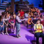 - The first-grade class gets ready for show-and-tell time, where Junie B. Jones, played by sophomore theatre major Ella Root, brings her new glasses. (Photo by Daniel Curd)