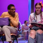 - Junie B. Jones, played by sophomore theatre major Ella Root, meets a character named Herb, played by freshman theater major Ashton Taylor, on the bus. (Photo by Daniel Curd)