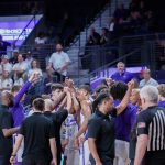 - The team comes in for a huddle during a timeout. (Photo by Daniel Curd)