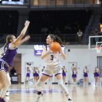 - Aspen Thornton, junior guard from Hot Springs Arkansas, brings the ball down court. (Photo by Hannah Park)