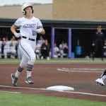 - Mercedes Eichelberger, senior outfielder from Tremonton, Utah, dashes toawds second base. (Photo by Hannah Park)