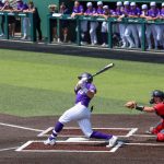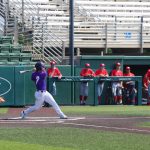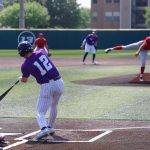 - Grayson Tatrow, senior outfielder from Mansfield, lunges forward after swinging. (Photo by Sarah Eunyoung Thompson)