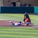 - Garrett Williams, junior infielder from Grand Praire, slides to home base. (Photo by Sarah Eunyoung Thompson)