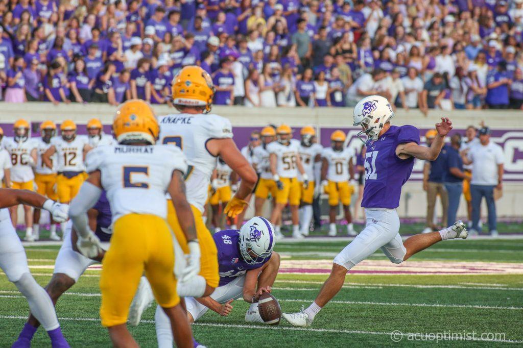 Kyle Ramsey, sophomore kicker from Missouri City, prepares to kick a field goal. (Photo by Daniel Curd)