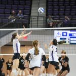 - Breanna Box, graduate middle blocker from Wichita Falls, jumps up to spike the ball. (Photo by Hannah Park)