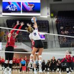 - Breanna Box, graduate middle blocker from Wichita Falls, jumps up to block the ball. (Photo by Daniel Curd)
