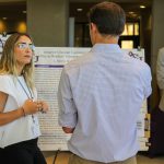 - Laci Harvey, sophomore kinesiology major from Dallas, talks to an attendee about her research. (Photo by Steven Infante)