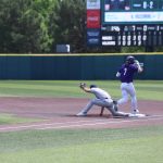 - Garrett Williams, senior infielder from Gran Prairie, runs to first base. (Photo by Hannah Park)