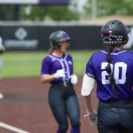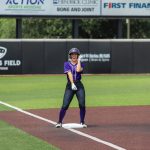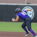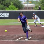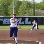 - Ella Beeman, freshman pitcher from Lowell, Arkansas, pitches the ball to the opposing team. (Photo by Hannah Park)