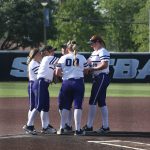 - Teammates gather at the pitchers mound for a conversation between plays. (Photo by Hannah Park)