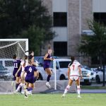 - Hannah Gage, graduate defender from Waco, jumps up to get a header. (Photo by Hannah Park)