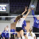 - Madeline Guffy, senior setter from Krum, sets the ball. (Photo by Hannah Park)