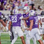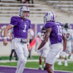 - Trey Cleveland, redshirt senior and wide receiver from Arlington, celebrates with Sam Hicks, redshirt senior and running back from Fort Worth. (Photo by Ashley Henderson)