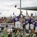 - Jerry Lawson, sophomore and defensive lineman from Breckenridge, and Kaghen Roach, redshirt senior and defensive lineman from Celina, attempt to block a Southern Utah field goal alongside other defensive players. (Photo by Ashley Henderson)