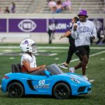 - Maverick McIvor, graduate quarterback from San Angelo, congratulates Javon Gipson, redshirt junior wide receiver from Richmond, on running a touchdown. (Photo by Daniel Curd)