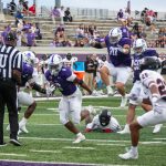 - Sam Hicks, redshirt senior and running back from Fort Worth, runs into the endzone. (Photo by Ashley Henderson)