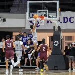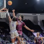 - Hunter Jack Madden, senior guard from Sydney, Australia, and Ma’Shy Hill, sophomore from Austin, attempt to gain possesion of the ball. (Photo by Makayla Clayton)